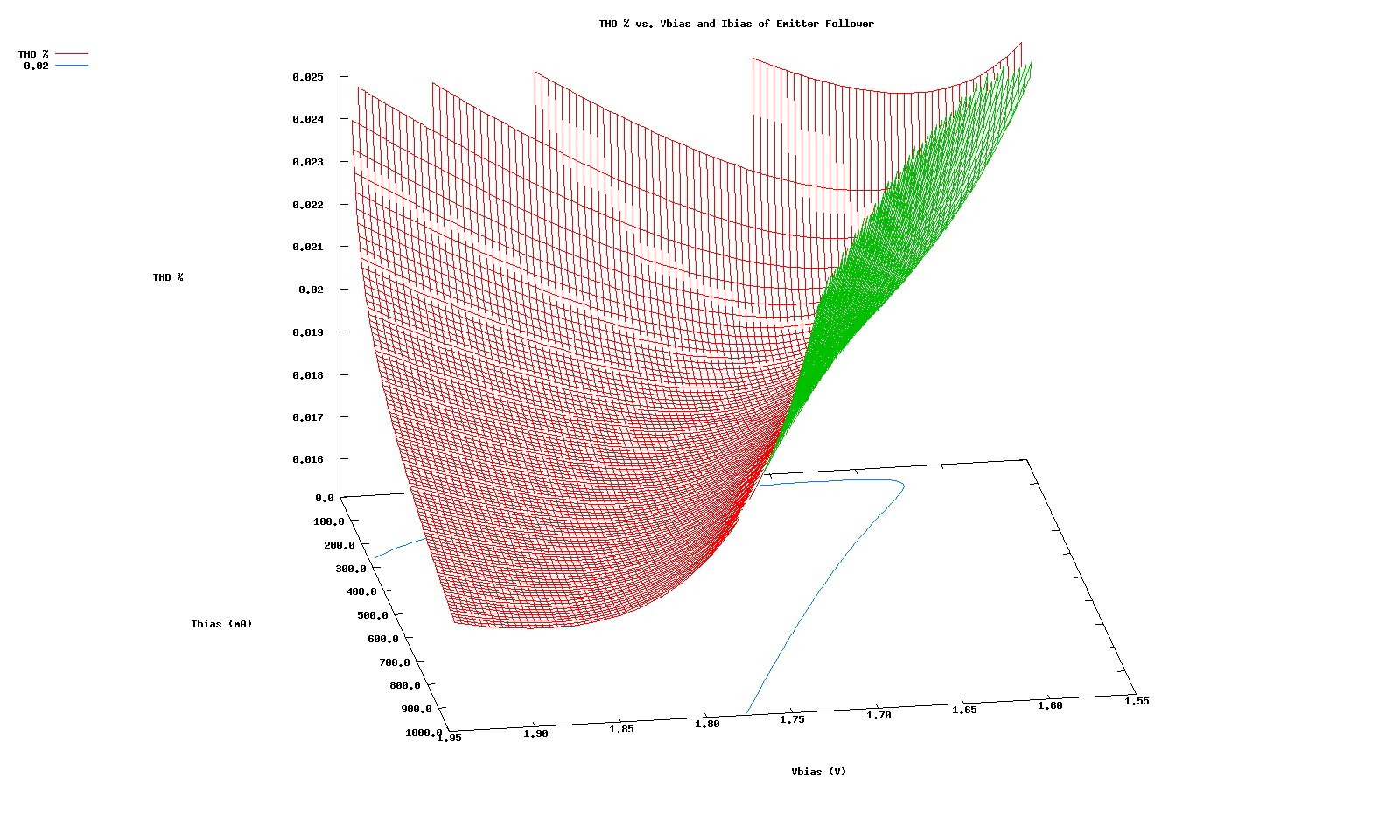 While still somewhat difficult to see, the global THD minimum point is actually at (Vbias=1.89V,Ibias=990mA) and its value is 0.01735%. This point lies at the extreme of Ibias. If Ibias were increased more, a new lower global THD minimum would most likely be found. Such values of Ibias however are rarely practical. They consume a large amount of power in the driver stage. The corresponding increase in Vbias consumes even more power in the final stage. If the design calls for some power efficiency a good THD-power tradeoff can be made by getting away from high (Ibias,Vbias) values. What makes this a good tradeoff is the gentle slope of the bottom parts of the surface. It's possible to pick a point with half as much Ibias (500mA) and still have essentially the same THD characteristic. It's also possible to have highly similar THD performance with even one quarter (250mA) of the Ibias current. There is of course a point of diminishing returns with these Ibias savings, since eventually the bias point moves up into the back corner and THD starts increasing at a very steep slope (rapidly).