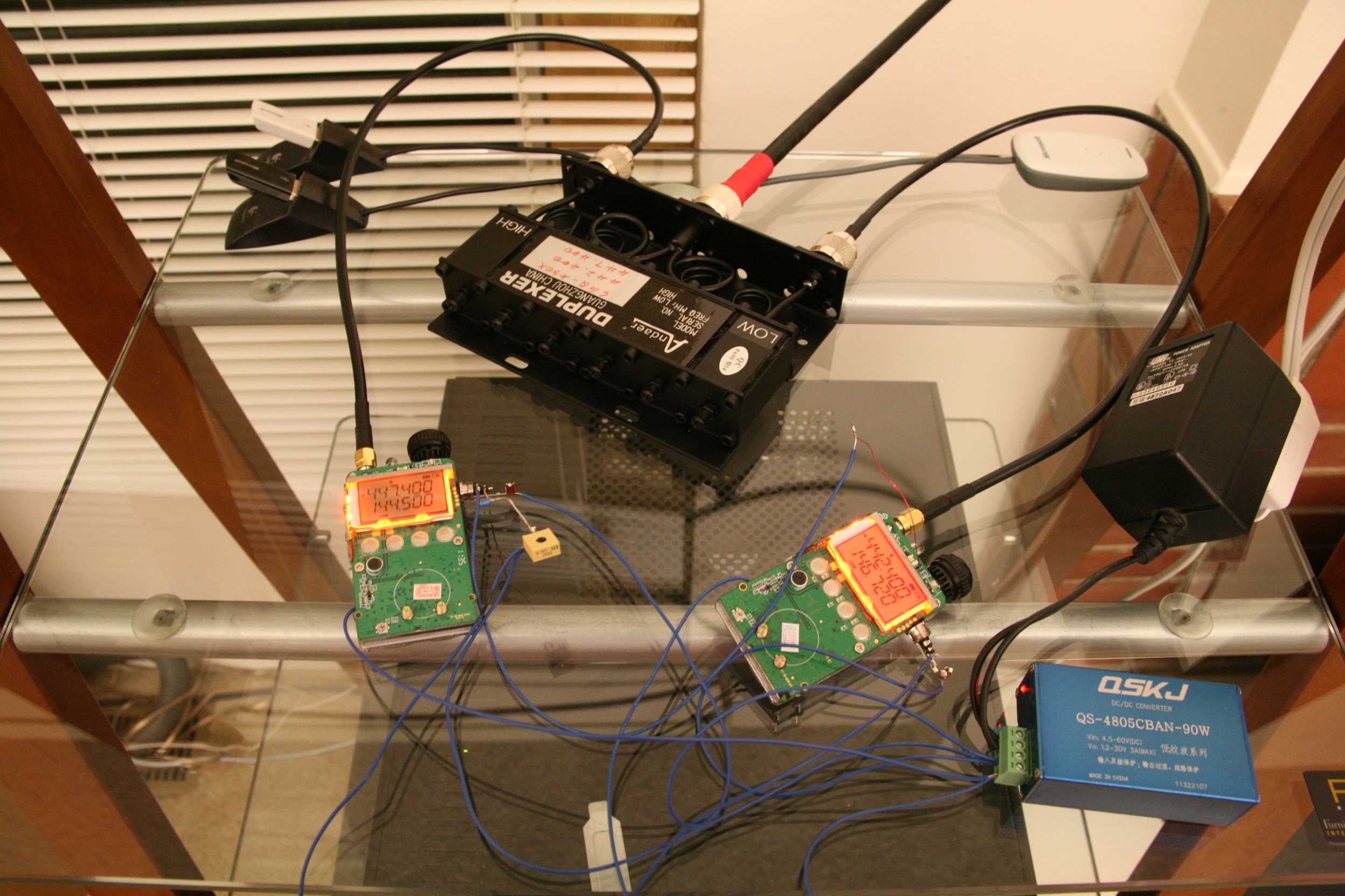 Measured sensitivity of a UV-3R with 1kHz tone, 4kHz deviation @ 12dB SINAD is -121dBm. With the about 1.6dB insertion loss of the duplexer, this should be down to -119.4dBm sensitivity. Isolation is pretty good at about -91dB as long as you associate the repeater's TX with the deeper of the two notches. This ends up being a negative shift config for users. Further performance can be achieved if the duplexer is staggered by more than 5MHz, but I wanted to stay somewhat standards compliant.